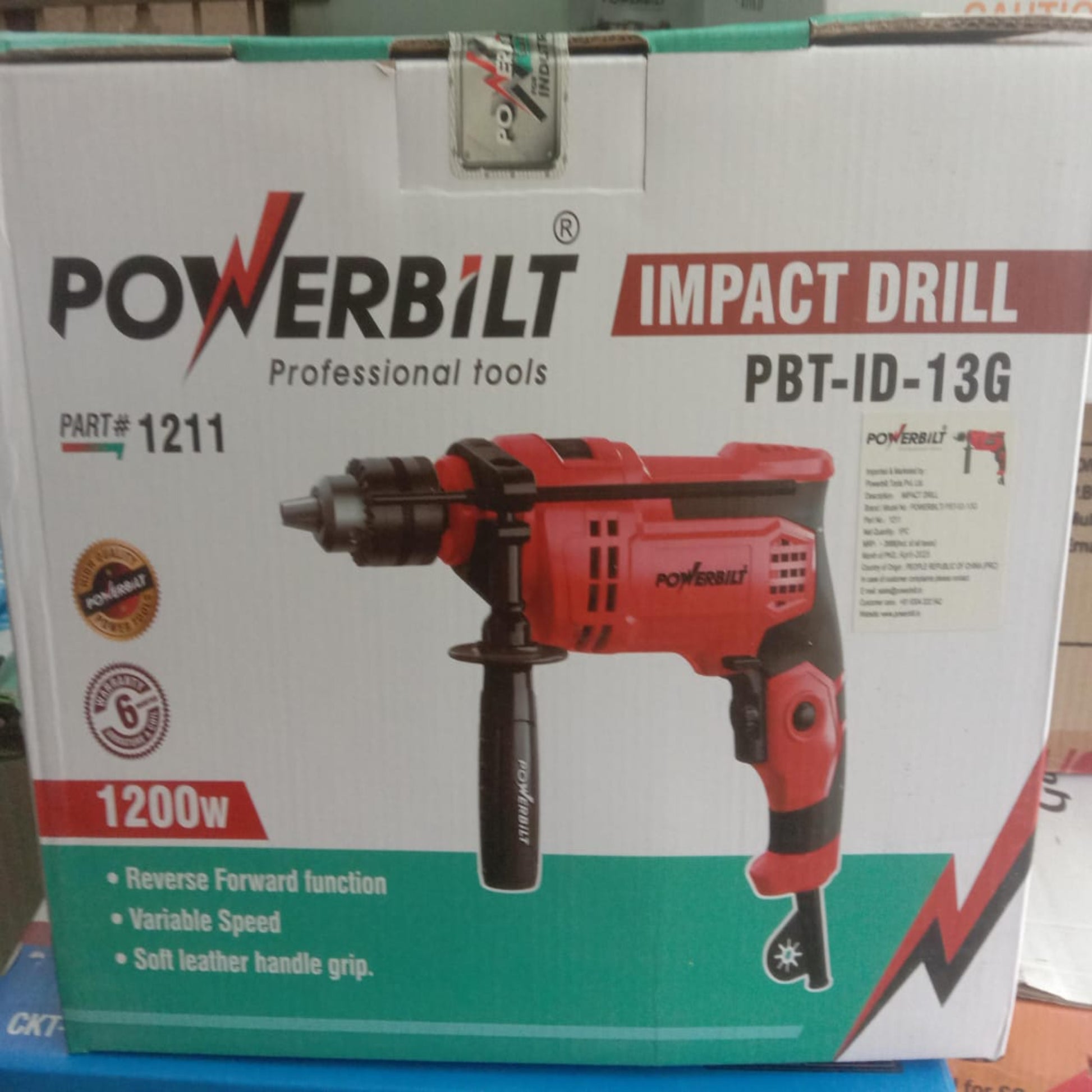 The Powerbilt PBT-ID-13G is a professional-grade 1200W impact drill built for heavy-duty drilling in wood, metal, and masonry. Featuring forward-reverse functionality, variable speed control, and a soft leather handle grip, it provides comfort and precision for prolonged usage. Designed for both professionals and DIY users, this drill offers exceptional torque and control for various applications.